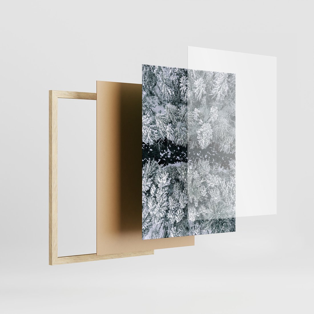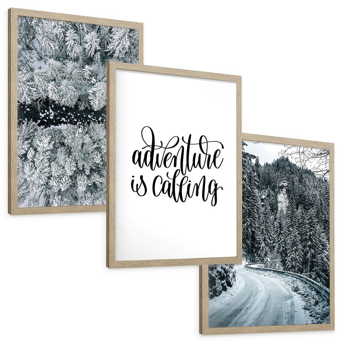 Zestaw obrazy w ramie, plakaty - zima, śnieg, las - rama drewno
