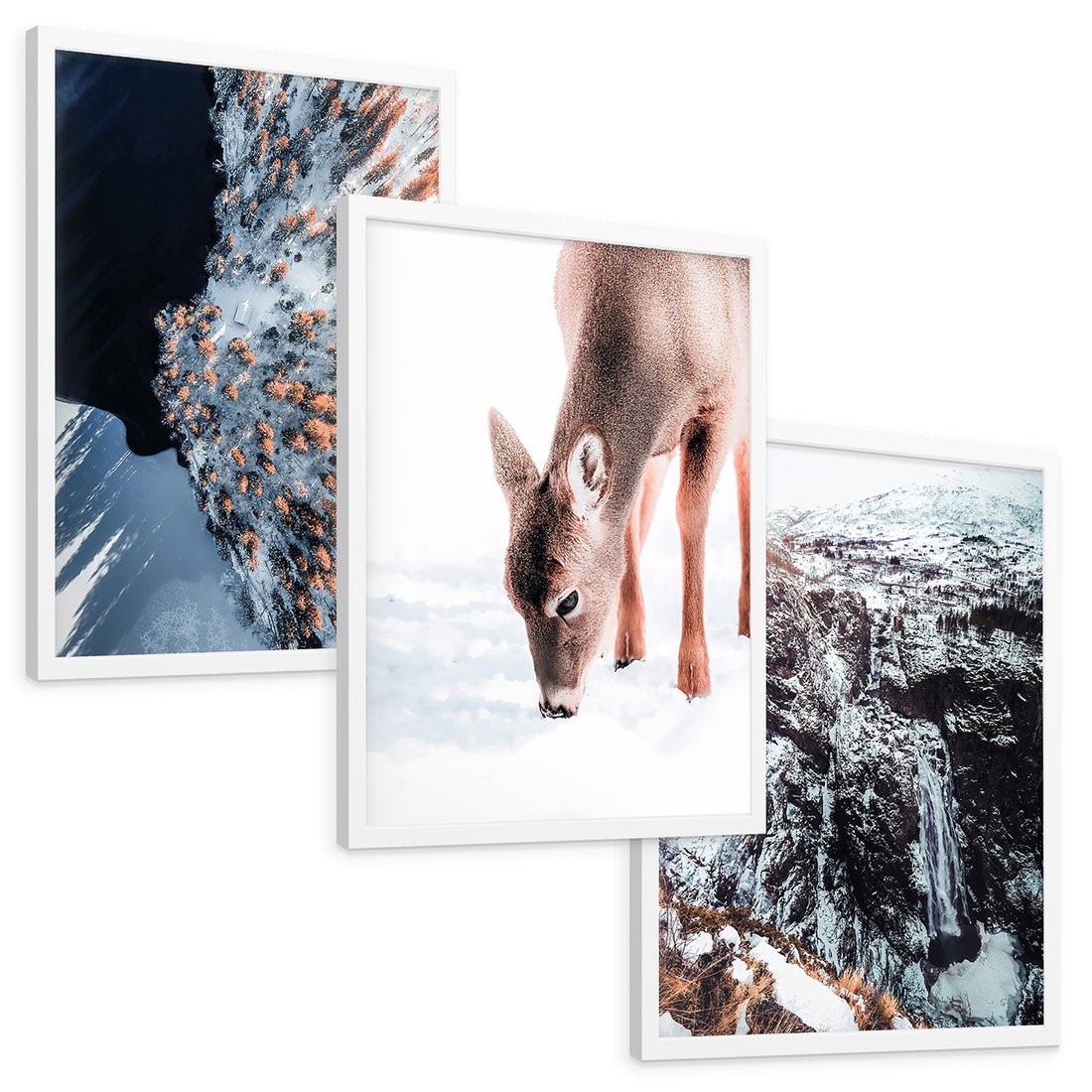 Zestaw obrazy w ramie, plakaty - zima, śnieg, natura - rama biała