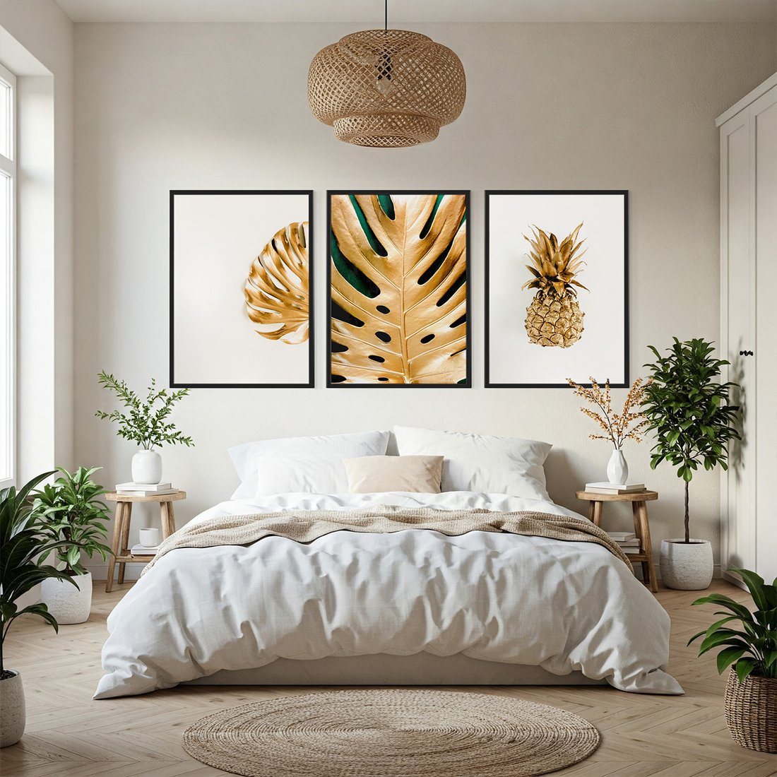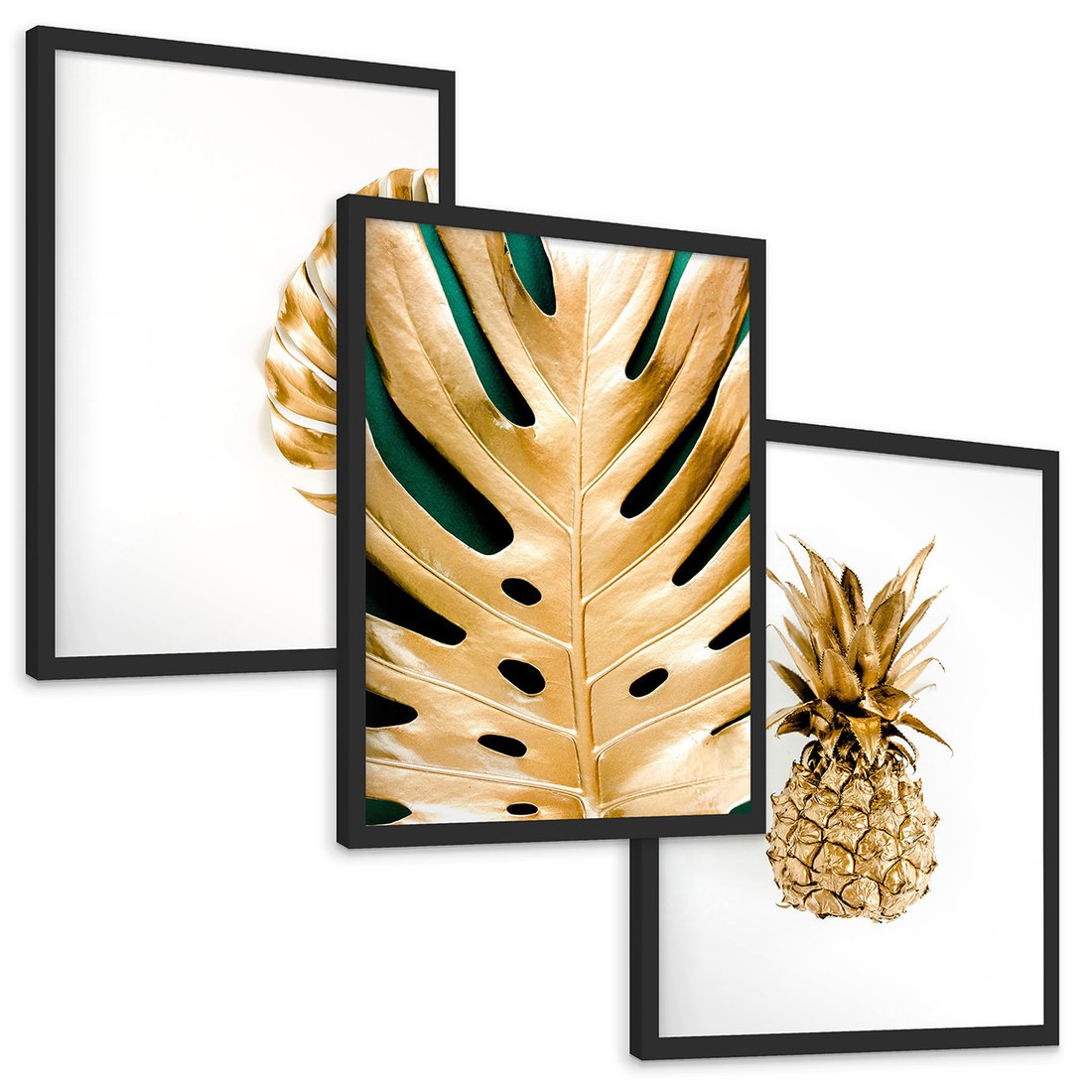 Zestaw obrazy w ramie, plakaty - złoty, liść, ananas - rama czarna