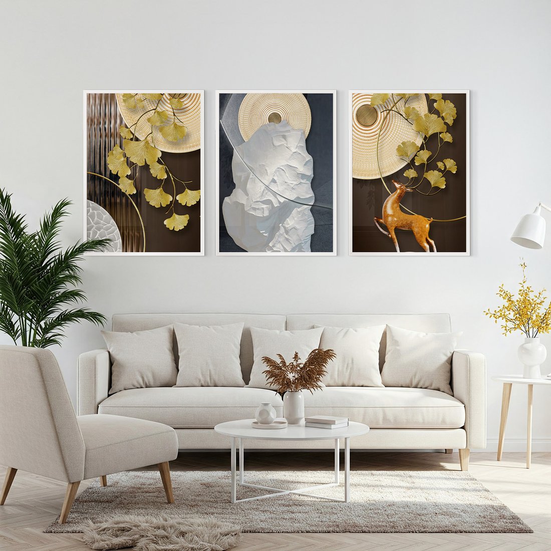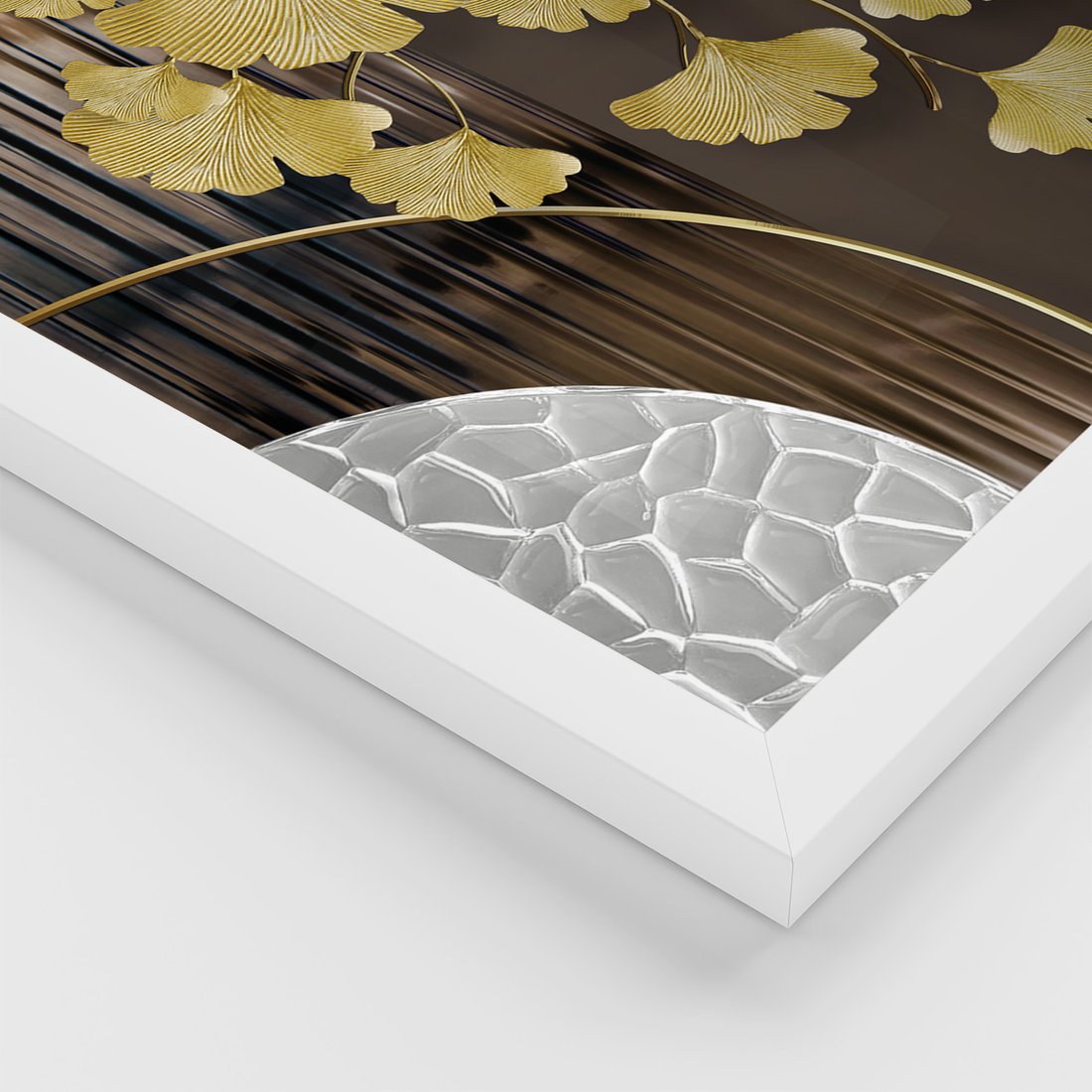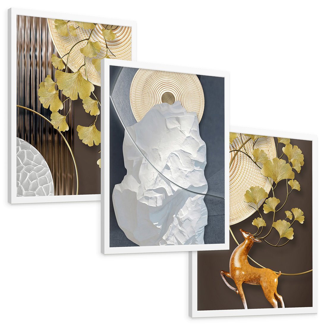 Zestaw obrazy w ramie, plakaty - złoty, liście, abstrakcja - rama biała