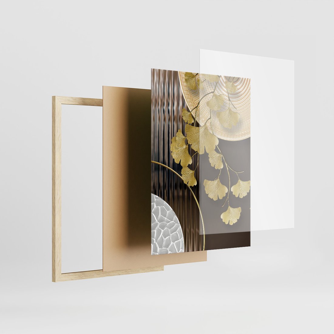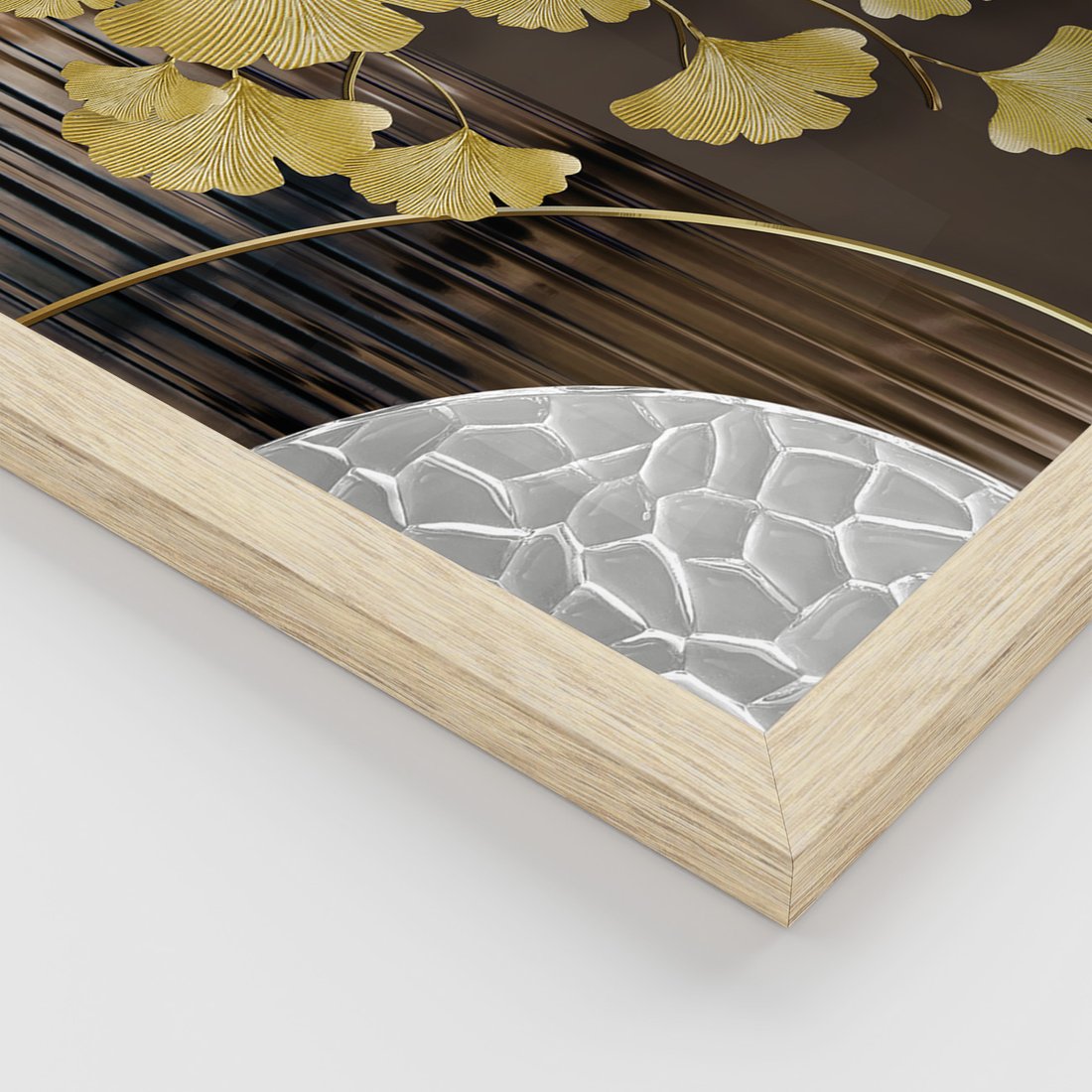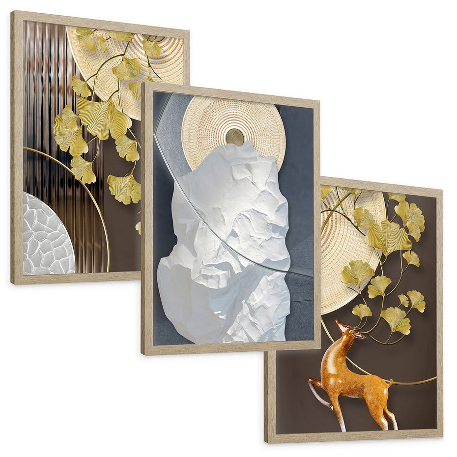 Zestaw obrazy w ramie, plakaty - złoty, liście, abstrakcja - rama drewno